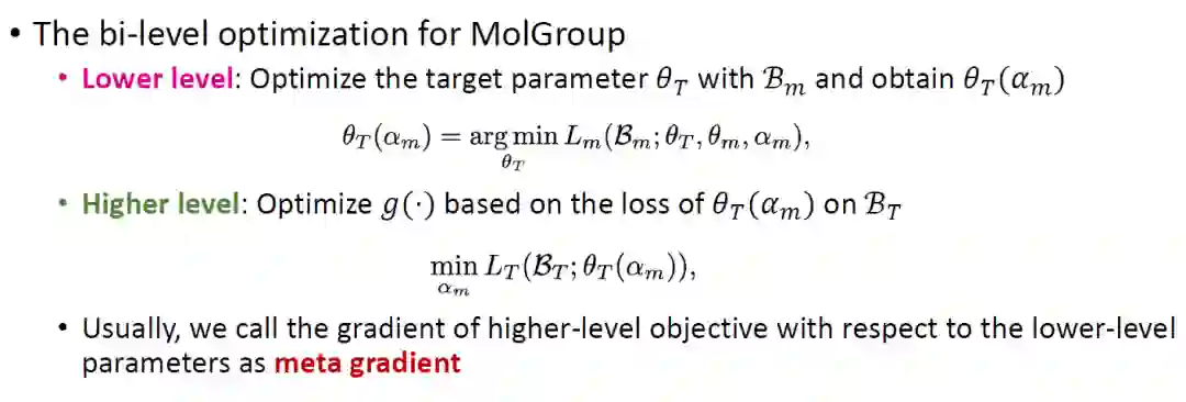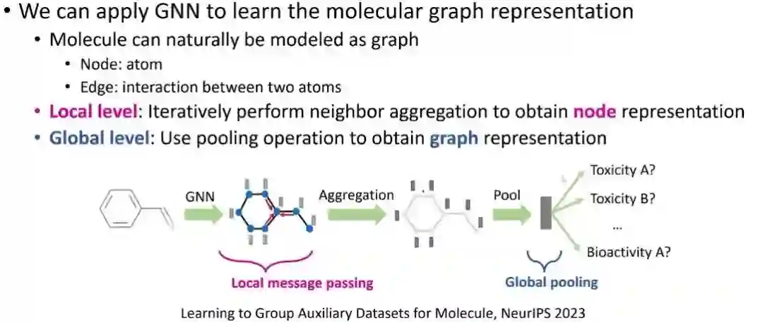 在做微调的时候也有一些有意思的技巧,这里关注分子结构的基础模型,怎样通过不同的任务和任务之间的相似度来增加模型微调的表现。这里介绍一篇最近发表在NeurIPS上面的论文。在分子结构上,我们可以有各种下游任务,例如可溶性、毒性或活性预测等,这是一个非常适合基础模型的场景。基本架构就是用GNN去编码一个分子输入,得到每个节点(原子)的嵌入,然后通过聚合或者池化操作得到分子的嵌入,然后预测各种分子级别的下游任务。Huang T, Hu Z, Ying R. Learning to Group Auxiliary Datasets for Molecule[J]. arXiv preprint arXiv:2307.04052, 2023.