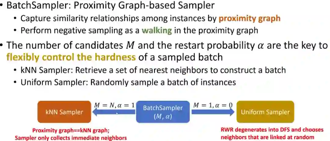 我们把这个方法叫做BatchSampler,它的想法就是通过在邻近图上做随机游走来控制采样到一些很高质量的负例。我们有一些超参数,首先就是最近邻的数量,还有就是随机游走的重启概率。可以想象,当重启概率是1的时候,也就是每走一步就会回到原点,那其实就是找一阶邻居,得到的样例很难。另一个极端是重启概率为0,那就是纯粹的随机游走,很容易走到很远的地方,获得很简单的样例。通过调重启概率,我们就可以找到想要难度的样例,这种方法可以用在各种模态的数据上面。
