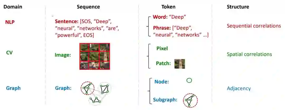需要注意的是,如果是GPT模型,需要迁移的部分不再是编码器,而是解码器(decoder)。然而,整体框架基本保持不变。对于图像基础模型的训练,同样可以采用这个框架。只需将输入数据从文字转换为图片,并采用编码器-解码器架构来获得自监督损失。在微调阶段,同样可以将编码器迁移过来,训练各种下游任务。这个框架在不同类型的数据(图、图像、文字等)中具有很高的通用性。 接下来,我们要考虑不同数据的模态。在**自然语言处理(NLP)领域,文本通常以句子的形式呈现。在每个句子中,我们能看到不同的单词,它们组成了不同的词组。类似地,在计算机视觉(CV)领域,数据则以图片的形式出现,而图片的基本单元可能是像素。在图****(Graph)**中,图的构成单元是节点,许多节点组成一个子图。