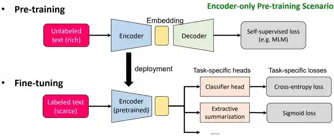 这个过程主要分为预训练(pre-training)和微调(finetuning)两个步骤。在预训练阶段,我们采用自监督学习方法,例如使用语言模型。首先,我们使用一个编码器,例如 transformer,对输入数据进行编码,然后得到一些嵌入(embedding)。接着,我们再从这个嵌入进行解码。在解码后,我们会采用一种自监督损失函数,例如掩码语言模型(mask language model)。完成预训练后,在微调阶段,我们将编码器固定下来,不再需要对该部分进行优化或仅优化很小一部分。然后,我们将输入数据直接通过这个编码器得到一个embedding,再从这个embedding进行各种下游任务的处理,包括文本分类、摘要和翻译等。在此过程中,我们会采用各种损失函数来微调下游任务。