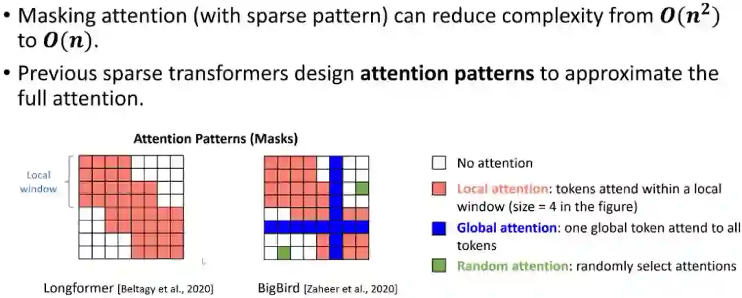 接下来我们用图的角度解释Transformer架构。由于Transformer架构的复杂度主要来自注意力机制,它的复杂度是O (token*token),这给Transformer应用于长序列带来了挑战。稀疏Transformer可以显著降低复杂度,我们可以将其想象成图的形式,这种注意力矩阵很像图的邻接矩阵。稀疏Transformer的核心思想是用局部注意力和随机注意力取代全局注意力,局部注意力是指设置一个很小的窗口,而随机注意力是指随机找一些连接来计算。