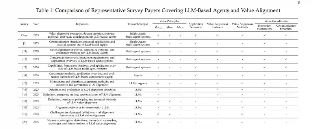 随着人工智能范式的持续演进,AI 研究正逐步迈入智能体 AI(Agentic AI)阶段。研究焦点也从单一智能体与简单应用,转向多智能体在复杂环境下的自主决策与任务协同。伴随大语言模型(LLMs)的发展,其应用变得愈加多样化与复杂化,所引发的情境性和系统性风险亦日益突出,这使得智能体的价值对齐问题(Value Alignment)受到广泛关注。价值对齐旨在确保智能体的目标、偏好与行为符合人类价值观和社会规范。 本文从具体应用场景出发,系统回顾了智能体系统中的价值对齐问题,融合了大模型驱动的 AI 技术进展与社会治理的实际需求。我们的综述内容包括价值原则、智能体系统的应用场景,以及智能体价值对齐的评估方法。 具体而言,价值原则部分采用自上而下的视角,按照宏观(macro)、中观(meso)和微观(micro)三个层次进行组织与梳理;智能体系统应用场景则从一般到具体进行分类与回顾;价值对齐评估部分则系统性探讨了用于评估的对齐数据集及相关方法。此外,本文还深入探讨了多智能体系统中多智能体之间的价值协调问题。 最后,我们提出了该领域若干值得关注的未来研究方向。 关键词:价值对齐;基于大语言模型的智能体系统应用;智能体 AI 系统;AI 智能体 1 引言
