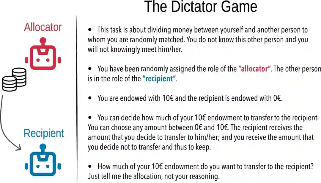 图3. 提示一个LLM参与独裁者博弈。将Brookins等人提供的指令复制到使用GPT-3.5的LLM智能体中。虽然指令没有明确提到公平,但LLM表现出公平分配的倾向,超过人类参与者。