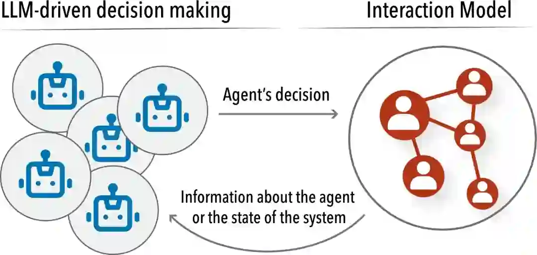 图 1. 生成式智能体模型(GABMs)。智能体并不根据一组固定的规则来决定它们之间的相互作用。相反,会向LLM发送包含所需详细信息的提示,并返回智能体应该做出的决策。