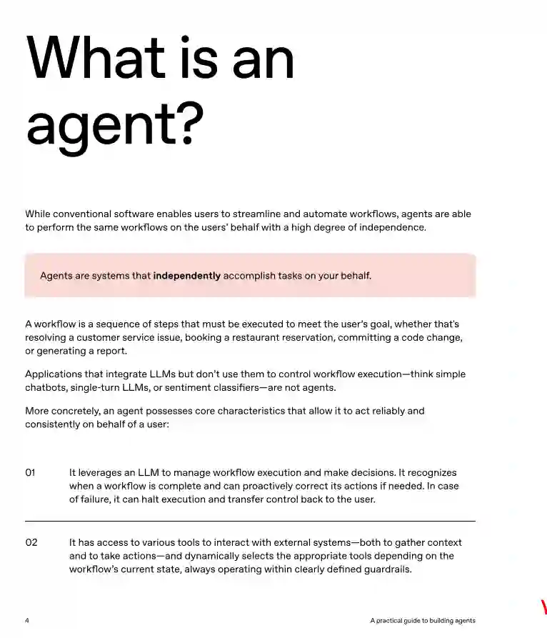大型语言模型(Large Language Models, LLMs)在处理复杂的多步骤任务方面正变得越来越强大。推理能力、多模态处理以及工具使用方面的进步,催生了一类新的基于LLM的系统——智能体(Agents)。 本指南专为产品和工程团队打造,旨在帮助他们探索如何构建首个智能体系统。我们从众多客户的实际部署中提炼出可操作的最佳实践,转化为切实可行的建议。本指南包括识别有潜力的用例的方法框架、设计智能体逻辑与编排的清晰模式,以及确保智能体安全、可预测、高效运行的最佳实践。 阅读本指南后,您将掌握构建智能体所需的基础知识,从而能够自信地开始开发自己的第一个智能体系统。 https://cdn.openai.com/business-guides-and-resources/a-practical-guide-to-building-agents.pdf