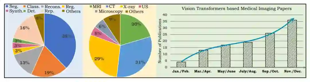 (左)饼状图显示了根据医学成像问题设置和数据模态所包括的调研论文的统计数据。最右边的数字显示了近期文献(2021年)的持续增长。Seg:分割,Class:分类,Recons:重建,Reg:配准,Synth:合成,Det:检测,Rep:报告生成,US:超声