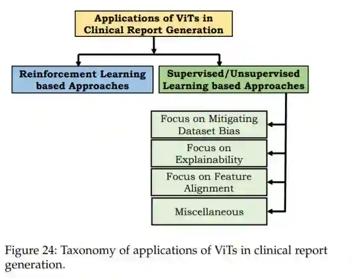 最近,利用深度学习技术从医学图像中自动生成临床报告取得了巨大进展[335]-[338]。这种自动生成报告的过程可以帮助临床医生做出准确的决策。然而,由于不同放射科医生报告的多样性、长序列长度(不像自然图像标题)和数据集偏差(与异常数据相比,更多的是正常数据),从医学图像数据生成报告(或标题)具有挑战性。此外,一个有效的医学报告生成模型有望处理两个关键属性:(1)语言流利性,便于人类阅读(2)临床准确性,以正确识别疾病及相关症状。在本节中,我们将简要描述变压器模型如何帮助实现这些预期目标,并有效地缓解前面提到的与生成医疗报告相关的挑战。具体来说,这些基于transformers的方法在自然语言生成(NLG)和临床疗效(CE)指标方面都取得了最先进的性能。还要注意的是,与主要讨论ViT的前几节不同,在本节中,重点是将transformer作为一种强大的语言模型来利用句子生成的长期依赖关系。由于其潜在的训练机制不同,我们将基于Transformers的临床报告生成方法大致分为基于强化学习(RL)和有监督/无监督学习方法,如图24所示。