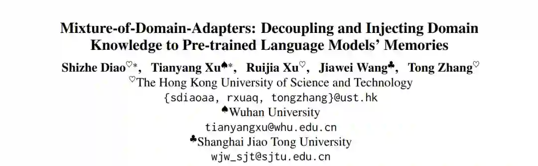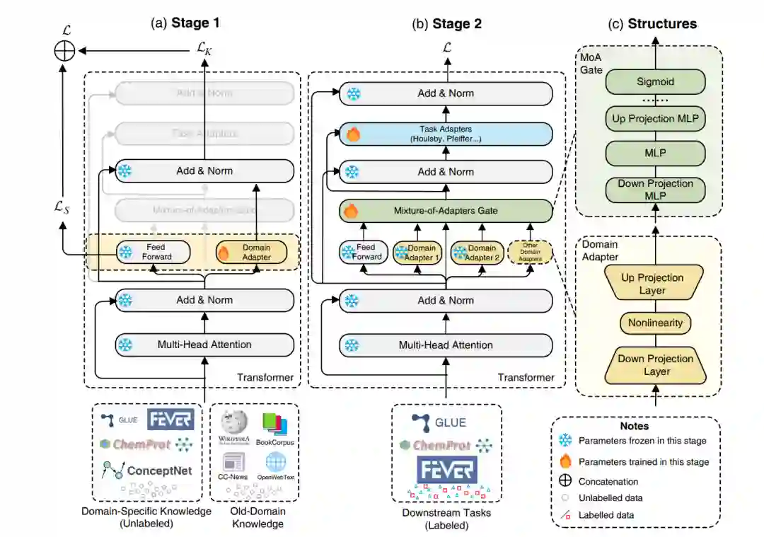 预训练语言模型(PLMs)在理解通用领域的文本方面表现出了卓越的能力,然而在特定领域的理解方面却面临挑战。尽管在大型特定领域语料库上进行连续预训练是有效的,但在该领域上调整所有参数的成本非常高。在本文中,我们研究了我们是否能够通过仅调整少数参数来有效且高效地适应 PLMs。具体而言,我们将 Transformer 架构的前馈网络(FFNs)解耦为两部分:原始预训练的 FFNs 用于保留旧领域知识,而我们创新的领域特定适配器则并行注入领域特定知识。然后,我们采用了一种混合适配器门来动态地融合来自不同领域适配器的知识。我们提出的领域适配器混合(MixDA)采用了两阶段适配器调优策略,利用无标签数据和有标签数据来帮助领域适应:i)在无标签数据上的领域特定适配器;接着是 ii)在有标签数据上的任务特定适配器。MixDA 可以无缝地插入预训练-微调范例,我们的实验表明,MixDA 在领域内任务(GLUE),领域外任务(ChemProt,RCT,IMDB,Amazon)以及知识密集型任务(KILT)上都实现了卓越的性能。进一步的分析证明了我们方法的可靠性,可扩展性和效率。