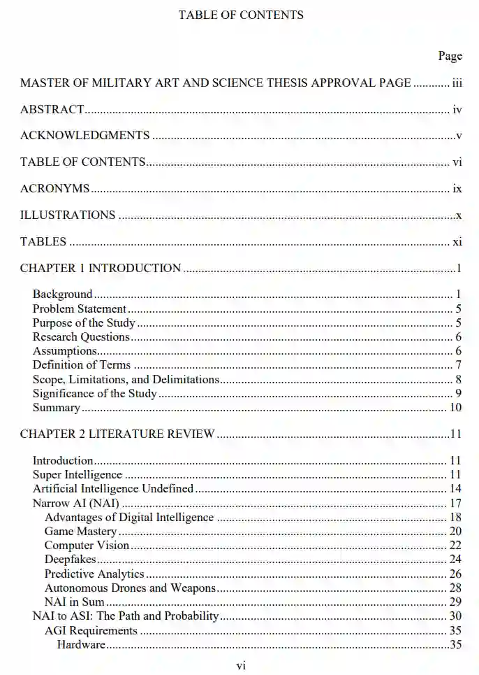 本论文试图回答的主要研究问题是:对手如何利用ASI来取代美国作为世界主导力量的地位?为了回答这个问题并达到研究的目的,还需要回答几个问题。 1.ASI有什么独特的能力,使它能够影响国家权力的信息和军事要素? 2.对美国有敌意的行为者如何利用ASI的能力来实现作战和战略效果? 3.在信息和军事领域有哪些弱点可以被拥有ASI的美国对手所利用?