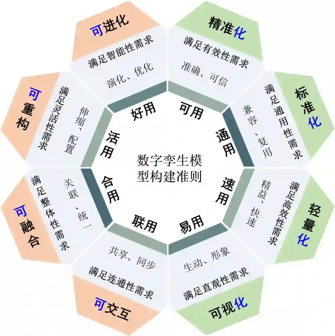 图1 数字孪生模型构建准则:**“四化四可八用”**为使数字孪生模型构建过程有据可依,本文提出了一套数字孪生模型“四化四可八用”构建准则,如图1所示。该准则以满足实际业务需求和解决具体问题为导向,以“八用”(可用、通用、速用、易用、联用、合用、活用、好用)为目标,提出数字孪生模型“四化”(精准化、标准化、轻量化、可视化)的要求,以及在其运行和操作过程中的“四可”(可交互、可融合、可重构、可进化)需求。具体内容见全文。