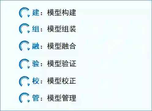 图2 数字孪生模型构建理论体系:“建-组-融-验-校-管”因此,本文提出了一套包括模型构建、模型组装、模型融合、模型验证、模型修正、模型管理在内的数字孪生模型构建理论体系,如图2所示。具体内容见全文。