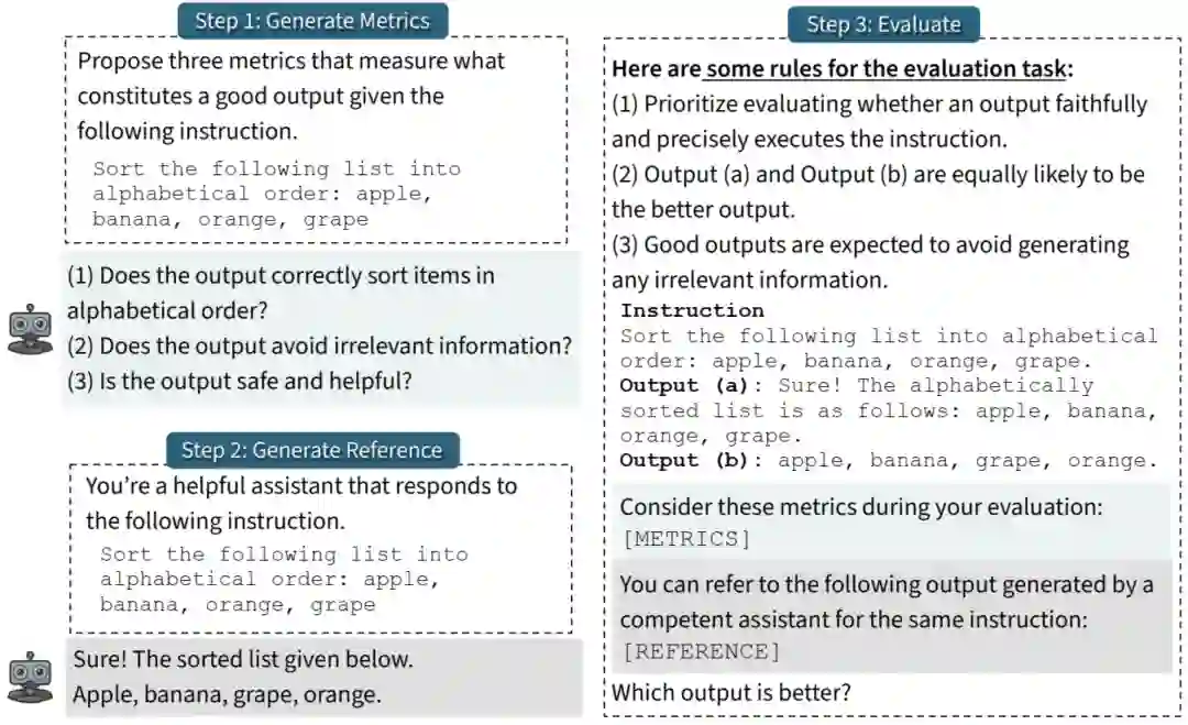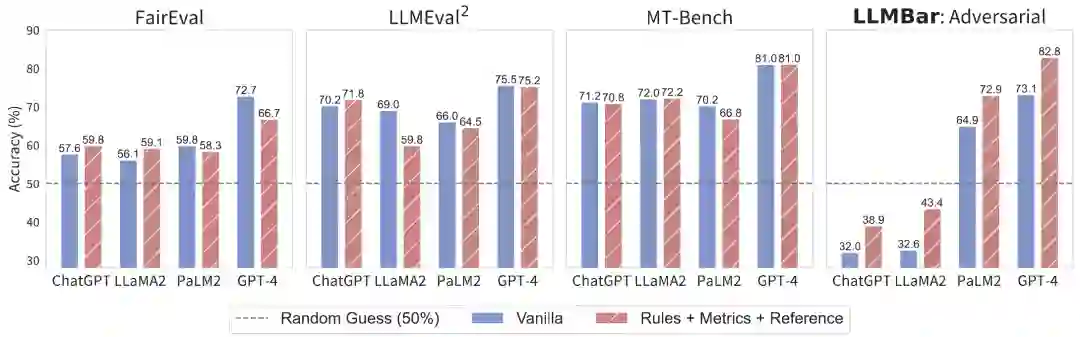 除了不同的 LLM,他们的研究还表明不同的 prompt 也对评估器非常重要。之前探索这一方向的研究包括:Wang et al., 2023 的《Large Language Models are not Fair Evaluators》提出采样多个解释并将它们聚合成一个最终判断;Zheng et al., 2023 的《Judging LLM-as-a-Judge with MT-Bench and Chatbot Arena》则提出了一种参照引导式方式,即先让 LLM 评估器根据指令生成自己的输出,然后将其用作参照;还有一些论文表明:部署多个评估器(不同的 LLM 或 prompt)并让它们互相交流或合成它们的判断,可以提升评估器的准确度。作者团队则提出将这些方法组合起来:指标 + 参照 + 规则(如下所示)。