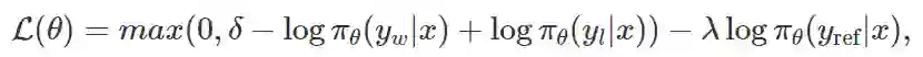 对比式方法。最后,还有一些新提出的方法非常近似对比学习思想:可以从模型获得好示例和差示例的概率,然后「促进」好示例,「压制」差示例。给定偏好数据,SLiC 和 RRHF 的做法是同时优化一个对比排名损失和一个正则化损失。举个例子,如下是 SLiC 损失函数: