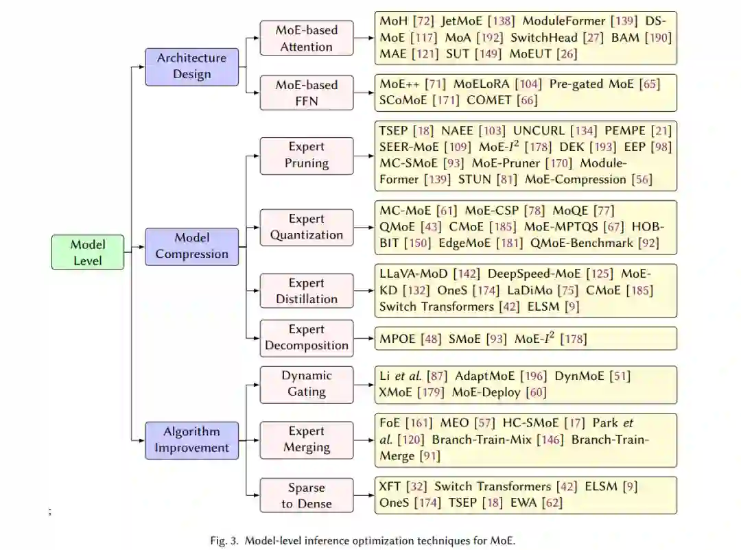 模型层级优化旨在通过架构、参数优化和算法设计的系统性改进,增强MoE模型的固有结构和效率。这些优化可以大致分为三个主要领域:高效的模型架构设计、模型压缩技术和算法改进。架构设计侧重于开发更高效的专家和注意力结构,压缩技术则通过剪枝、量化和知识蒸馏等方法,减少模型大小和内存占用。算法改进则集中在提升MoE模型的动态特性,包括路由机制和专家组合策略。图3展示了本节的详细结构。