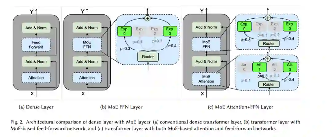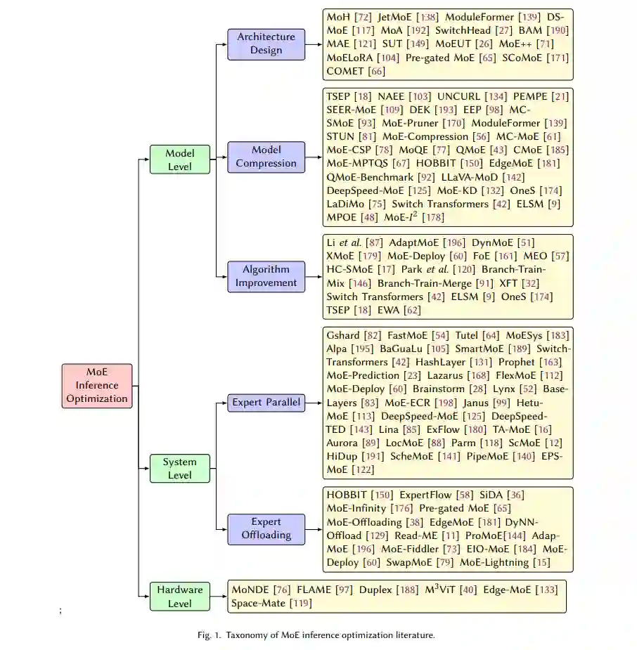 大规模混合专家(MoE)模型的出现标志着人工智能领域的一项重大进展,通过条件计算提供了更强的模型容量和计算效率。然而,这些模型的部署和推理在计算资源、延迟和能效方面提出了显著的挑战。本综述系统地分析了当前混合专家模型推理优化技术的全貌,涵盖了整个系统堆栈。我们首先建立了一个分类框架,将优化方法分为模型级、系统级和硬件级优化。 在模型级别,我们考察了包括高效专家设计、注意力机制、修剪、量化、知识蒸馏等各种压缩技术,以及动态路由策略和专家合并方法等算法改进的架构创新。系统级别上,我们研究了分布式计算方法、负载平衡机制和高效调度算法,这些方法使得可扩展部署成为可能。此外,我们还深入探讨了硬件特定的优化和协同设计策略,以最大化吞吐量和能效。 本综述不仅提供了现有解决方案的结构化概述,还识别了混合专家推理优化中的关键挑战和有前景的研究方向。我们的全面分析为研究人员和从事大规模 MoE 模型资源受限环境部署的实践者提供了宝贵的资源。为了便于后续更新和分享 MoE 推理优化研究的最新进展,我们已建立了一个公开的资源库,网址为:https://github.com/MoE-Inf/awesome-moe-inference/
