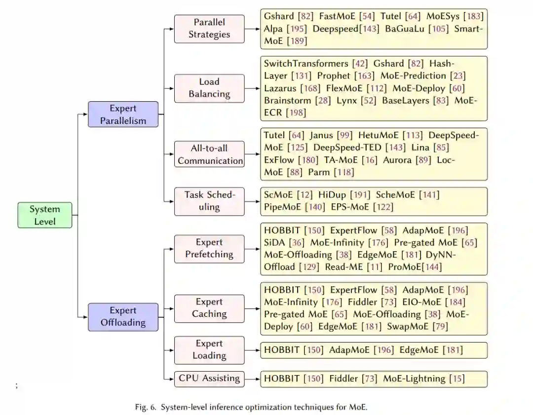 由于MoE架构的独特结构,许多研究集中在通过利用该架构固有的稀疏激活模式来加速推理过程,尤其是在系统层级。通常,MoE模型在两种场景下部署:云环境中的多个服务器和边缘环境中的单个设备。在云集群中,MoE模型分布在多个设备上,以实现并行执行。除了传统的并行化技术,如数据并行、张量并行和流水线并行[69, 110, 126],专家并行是专门为MoE模型量身定制的特殊方法。在边缘设备上,受限于GPU内存,往往无法容纳MoE模型的所有参数,因此需要将部分参数卸载到CPU内存或SSD存储中。为了解决这一问题,专家卸载技术被开发出来,以充分利用专家的稀疏激活模式,实现高效执行。图6展示了本节的详细结构。