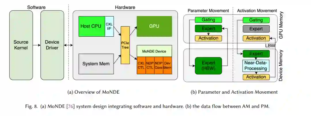最近针对MoE推理的硬件优化通过新颖的架构和共设计方法解决了关键挑战。这些优化主要针对每字节操作数(Op/B)效率、异构计算单元和内存访问模式等关键问题。以下讨论了硬件层级解决方案中的一些重要进展。 MoNDE [76] 引入了一种近数据处理(NDP)解决方案,旨在解决稀疏激活和专家参数传输开销的问题(图8)。该架构将基于CXL(计算扩展链接)的NDP控制器与专用的NDP核心结合,用于内存中的计算,利用LPDDR SDRAM(低功耗双倍数据速率同步动态随机存储器)提供高带宽和能效。系统实现了一种混合计算策略,其中GPU处理频繁访问的“热”专家,而NDP单元处理“冷”专家,通过激活移动范式而非传统的参数移动来实现并行执行。 FLAME [97] 是第一个完全利用MoE稀疏性加速变换器在FPGA上的框架。在模型的参数级别,FLAME采用M:N剪枝来减少不必要的计算,这可以在列平衡结构剪枝和无结构剪枝之间取得平衡;在专家级别,通过CEPR(循环专家预测)进行稀疏激活预测。通过改变专家激活路径的模式,可以有效提高专家预测的准确性。然后,使用双缓冲机制在计算前一个专家的同时加载预测的专家,以提高专家部署效率。 M3ViT [40] 和 Edge-MoE [133] 基于多任务场景中的注意力计算重排序构建了它们的FPGA架构。对于推理,M3ViT 只激活与任务相关的稀疏“专家”路径,以提高效率,并通过硬件级共设计实现任务之间的零开销切换。Edge-MoE 是首个用于多任务ViT的端到端FPGA实现,提出了一些激进的技术,包括一种近似方法来解决FPGA上GELU函数计算的复杂性,以及一个统一的线性层模块,以实现硬件资源的高效重用。 Duplex [188] 为每个层级执行选择适合的目标设备,该设备结合了xPU和逻辑PIM(内存中处理)。这意味着它可以集成两种类型的处理单元,共享设备内存。由于这两种处理单元之间在计算和内存访问方面的瓶颈,能够在同一设备上同时实现高计算和内存访问利用率。此外,它还引入了一种替代PIM微架构。逻辑PIM通过逻辑芯片上的强大处理单元以及更多的硅通孔(TSVs)优化了低Op/B操作,从而实现了DRAM芯片和逻辑芯片之间的高带宽通信。此外,它可以并行执行专家和注意力阶段,以最大化推理效率。 Space-mate [119] 提供了其在移动设备上用于SLAM(同时定位与建图)任务的加速器设计。主要包括一个无序(OoO)SMoE路由器,用于缓解低延迟的数据传输,以及单跳(SS)和双跳(DS)异构核心架构,利用相同专家中相似零模式导致的粗粒度稀疏性,以实现高吞吐量和能效。