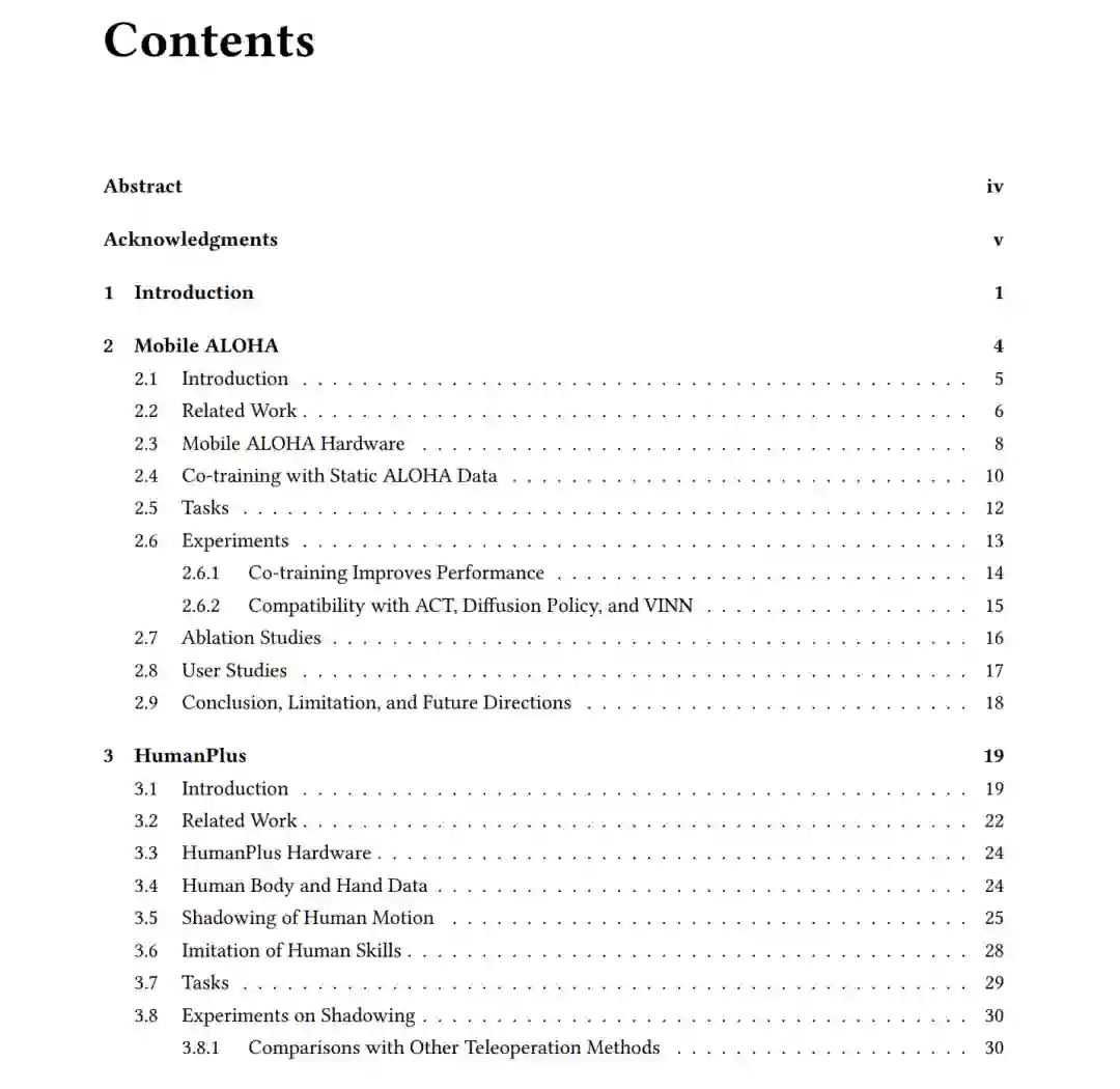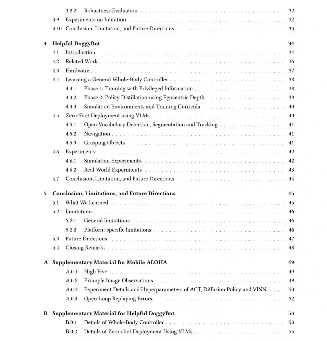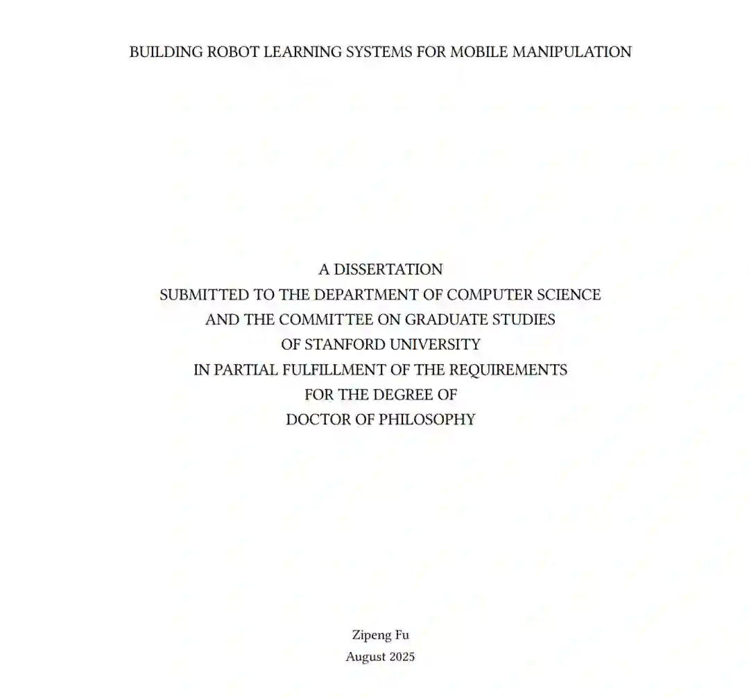机器学习已在机器人学的多个子领域成功应用,包括操作、导航与运动,推动了感知、规划与控制的数据驱动进展。然而,要在现实环境中部署通用机器人系统,必须具备集成的全身能力:既能改变机器人自身状态(移动能力),又能改变外部实体与环境状态(操作能力)。例如,即使执行打开壁挂式柜门这类相对简单的任务,也需要在稳定抓握双门把手的同时,通过后退或倾斜等动作实现协调的全身运动——这充分证明了操作与移动能力需要实现无缝协同。 本论文提出了一种新型机器人学习系统,其核心设计理念在于充分利用操作与移动之间的协同效应,将移动操作视为一个统一性问题而非独立子系统的简单组合。这些系统通过模仿学习人类演示数据,并结合机器人试错中的强化学习,使机器人能够掌握协调行为——无论是涉及灵巧手/抓取器与腿式/轮式移动平台的协同作业。 此外,我们研发了与这些学习系统配套的开源移动操作平台。这些机器人学习软件与硬件系统共同为更广泛的机器人学界提供了易于获取且成本可控的研究选项,有力推动了机器人学领域的可复现性与协同发展。