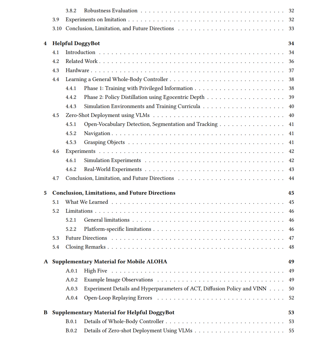 机器学习已在机器人学的多个子领域成功应用,包括操作、导航与运动,推动了感知、规划与控制的数据驱动进展。然而,要在现实环境中部署通用机器人系统,必须具备集成的全身能力:既能改变机器人自身状态(移动能力),又能改变外部实体与环境状态(操作能力)。例如,即使执行打开壁挂式柜门这类相对简单的任务,也需要在稳定抓握双门把手的同时,通过后退或倾斜等动作实现协调的全身运动——这充分证明了操作与移动能力需要实现无缝协同。 本论文提出了一种新型机器人学习系统,其核心设计理念在于充分利用操作与移动之间的协同效应,将移动操作视为一个统一性问题而非独立子系统的简单组合。这些系统通过模仿学习人类演示数据,并结合机器人试错中的强化学习,使机器人能够掌握协调行为——无论是涉及灵巧手/抓取器与腿式/轮式移动平台的协同作业。 此外,我们研发了与这些学习系统配套的开源移动操作平台。这些机器人学习软件与硬件系统共同为更广泛的机器人学界提供了易于获取且成本可控的研究选项,有力推动了机器人学领域的可复现性与协同发展。