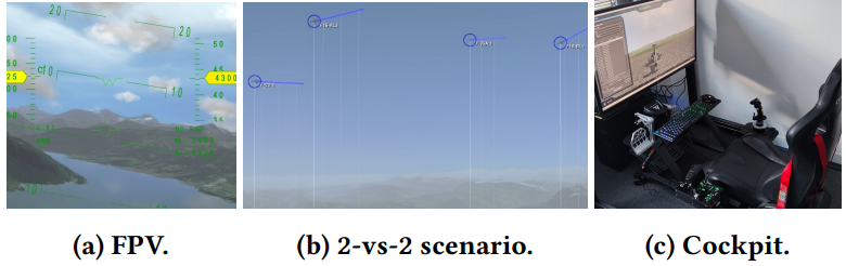 将人工智能(AI)的巨大潜力从战略任务扩展到空战等安全关键领域,需要逼真的模拟和交互设置,使人类能够在训练与执行过程中影响和评估AI智能体。尽管存在多种作战环境[5, 11],但仅有少数能提供逼真的飞行动力学模拟,而能实现AI模型与人类用户直接交互的则更为稀少[3, 4, 12]。洛克希德·马丁公司在DARPA“阿尔法狗斗试验”中的开创性工作,首次强调了人在回路的1对1空战场景中人机交互的重要性[10]。将人类纳入回路对于确保AI系统符合人类判断与安全约束至关重要,同时也能在高风险领域培养信任并发挥互补优势。然而,在多智能体防御设置中的人机交互仍相对未被充分探索。本研究贡献了一个模块化框架以弥合这一差距。该系统使用多智能体强化学习(MARL)在自定义的3D环境中训练智能体,该环境确保了精确的飞行动力学仿真。利用IEEE标准的分布式交互仿真(DIS)协议[6],我们开发了一个通信接口,允许将MARL智能体无缝部署到VRForces(VR-F)中——VR-F是国防组织使用的战术模拟器(图1a和图1b)。此集成实现了人类操作的实体与AI控制的飞机之间的实时交互,促进了竞争性智能体行为并增强了军事人员的训练真实感。据我们所知,这是首个将MARL智能体集成到VR-F中以实现人机编组的方法。这为战术创新和探索作战任务中的创新策略开辟了新途径。