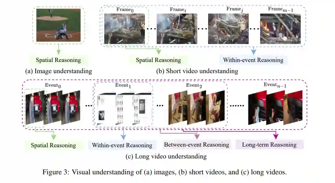 视觉推理要求模型能够理解和解释视觉信息,并将多模态感知与常识性理解相结合(Johnson等, 2017; Chen等, 2024c)。视觉推理任务主要有三种类型:视觉问答(VQA)、视觉字幕生成(VC)或描述(VD),以及视觉对话(VDia)。VQA(Antol等, 2015; Zakari等, 2022)涉及根据输入的视觉数据和伴随的问题生成自然语言答案。VC和VD系统(Vinyals等, 2015; Sharma等, 2018; Li等, 2019)分别生成简洁的自然语言句子以总结视觉数据的主要内容,或生成详细且全面的视觉数据描述。VDia(Das等, 2017; Qi等, 2020)则涉及围绕视觉内容进行的多轮对话,由一系列问题-答案对组成。 图像理解。如图3(a)所示,图像理解任务涉及单张图像的各种视觉推理任务,例如图像字幕生成和以图像为中心的问答(Sharma等, 2018; Mathew等, 2021; Changpinyo等, 2022; Li等, 2023a; Chen等, 2024a)。这些任务仅关注空间信息,包括对全局视觉内容的粗粒度理解(Ordonez等, 2011; Sohoni等, 2020)以及对局部视觉细节的精细理解(Wei等, 2021; Liu等, 2024b; Peng等, 2024)。 短视频理解。与图像理解任务仅涉及静态视觉数据不同,短视频理解还结合了多帧视觉数据中的时间信息(Xu等, 2016; Bain等, 2021; Li等, 2023b, 2024e)。除了空间推理(Ranasinghe等, 2024)外,事件内的时间推理和跨帧的时空推理对于短视频理解至关重要(Huang等, 2018; Lin等, 2019; Diba等, 2023)。 长视频理解。长视频通常跨越数分钟甚至数小时,通常包含多个事件,与短视频相比,长视频涵盖更丰富的空间内容和时间变化(Mangalam等, 2024; Li等, 2024f; Song等, 2024a,b)。如图3(c)总结的那样,长视频理解不仅涉及空间和事件内的时间推理,还涉及事件间的推理和跨不同视频事件的长期推理(Wu等, 2019; Wu和Krahenbuhl, 2021; Wang等, 2023a; Zhou等, 2024; Fang等, 2024)。
