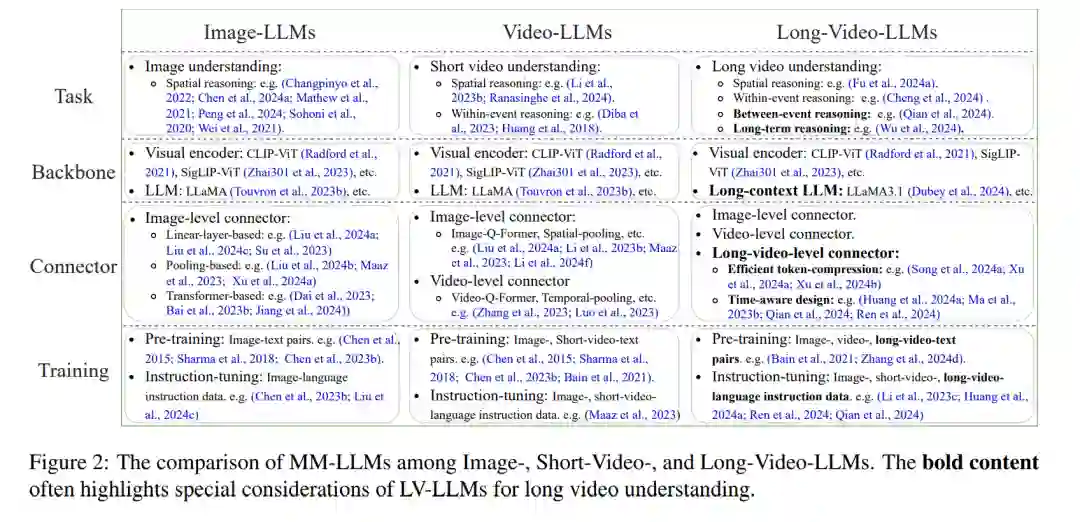 与图像和短视频相比,长视频带来了全面视觉理解的新挑战,具体如下: 丰富的细粒度时空细节。长视频涵盖广泛的主题、场景和活动,包含不同的细节,如物体、事件和属性(Fu等, 2024a; Wu等, 2024)。与静态图像和具有相似多帧的短视频相比,这些细节更加丰富,使长视频理解更具挑战性。例如,可以在任何帧中引入细粒度的空间问答,而时间问答可以在长视频推理任务的帧间或帧内引入(Song等, 2024a)。用于长视频理解的多模态LLMs必须捕捉跨越数分钟甚至数小时的视频帧中的所有相关细粒度时空细节,并使用有限数量的视觉标记。 场景转换和内容变化中的动态事件。长视频通常包含各种动态事件,场景和内容变化显著(Wu等, 2024)。这些事件可能根据出现的顺序在语义上相关并按时间协调(Bao等, 2021),也可能由于情节反转(Papalampidi等, 2019)而表现出显著的语义差异。事件间推理涉及多个具有不同视觉信息的事件,对于准确的内容理解至关重要(Cheng等, 2024a; Qian等, 2024)。对于多模态LLMs来说,区分语义差异并在不同事件中保持语义一致性对长视频理解尤为重要。 长期关联和依赖关系。长视频通常包含跨长时间段的动作和事件。捕捉长期依赖关系并理解视频的不同部分在长时间段内如何相互关联是一项挑战(Wu等, 2019)。用于图像或短视频的LLMs通常无法将当前事件与远离当前时间的过去或未来事件联系起来(Wu和Krahenbuhl, 2021),也无法进行长期决策(Wang等, 2024b)。
