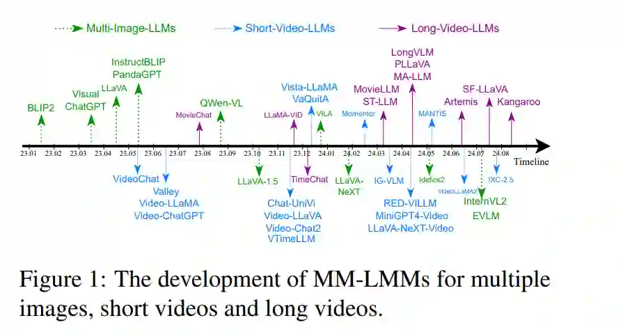 大型语言模型(LLMs)与视觉编码器的集成最近在视觉理解任务中展示了令人瞩目的表现,充分利用了它们理解和生成类人文本以进行视觉推理的固有能力。鉴于视觉数据的多样性,多模态大型语言模型(MM-LLMs)在理解图像、短视频和长视频时,在模型设计和训练上表现出不同的变异性。本文重点讨论长视频理解相较于静态图像和短视频理解所带来的巨大差异和独特挑战。与静态图像不同,短视频包含具有空间和事件内时序信息的连续帧,而长视频则由多个事件组成,涵盖事件间和长期时序信息。在本次综述中,我们旨在追踪并总结从图像理解到长视频理解的MM-LLMs进展。我们回顾了各种视觉理解任务的差异,强调了长视频理解中的挑战,包括更细粒度的时空细节、动态事件以及长期依赖关系。接着,我们详细总结了在长视频理解中MM-LLMs的模型设计和训练方法的进展。最后,我们比较了现有MM-LLMs在不同长度视频理解基准测试中的表现,并讨论了MM-LLMs在长视频理解中的未来潜在发展方向。