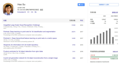 Hao Su,北京航空航天大学应用数学博士、斯坦福大学数学与计算机科学博士,目前在加州大学圣迭戈分校担任副教授(兼职)。他的研究领域涵盖了计算机视觉、计算机图形学、机器学习和通用人工智能以及机器人技术。去年,他参与创办了一家名为 Hillbot 的机器人公司,并担任 CTO。目前,他的论文被引量已超过 12 万。