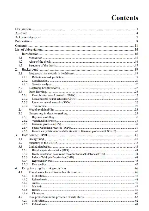 风险模型对于护理计划和疾病预防至关重要。已有的临床模型表现不佳,引起了广泛的关注和担忧。一个准确、可解释、可靠的风险模型将会带来巨大的益处,但其仍是一项挑战。本论文旨在开发深度学习模型,利用大规模且具有代表性的电子健康记录(EHR)数据集,以提供更准确的风险预测,同时提供不确定性估计和医学解释的能力。 在这篇论文中,我们研究了三个方向:风险预测、解释性以及不确定性估计。对于风险预测,我们研究了可以将最少处理的电子健康记录(EHR)纳入模型的深度学习工具,并与已建立的机器学习和临床模型进行了全面比较。另外,我们将事后解释应用于深度学习模型以获取医学信息,特别关注风险关联和反事实推理的解释。我们使用概率建模技术定性地研究了不确定性估计。我们的分析依赖于临床实践研究链接,该链接包含来自初级护理、二级护理和死亡登记的匿名化EHR,并代表了英国人口。