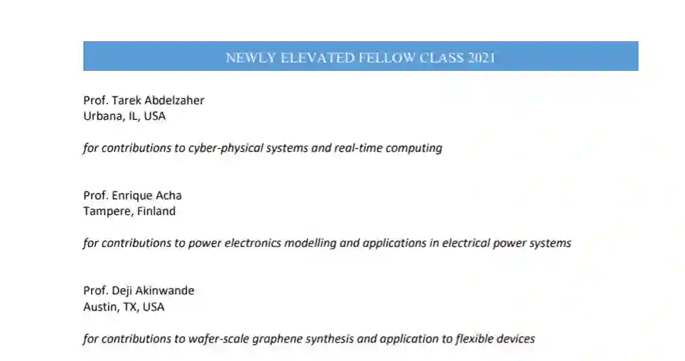 【导读】日前,全球最大的非营利专业技术学会IEEE(国际电气与电子工程师协会)发布了2021年度新当选会士(Fellow)名单 (IEEE Society Report《IEEE Fellows Elevated as of January 2022》),一共新增310名Fellow。当选的中国大陆 Fellow来自清华大学、北京大学、中国科学技术大学等机构。在新的名单中,我们看到了一些非常熟悉的名字:百度王海峰,北京大学田永鸿,西北工业大学韩军伟,中科院计算所山世光,电子科技大学申恒涛,王井东,谢幸,清华电子工程系系主任汪玉,华北电力大学毕天姝教授、成都理工大学黄琦教授、天津大学金建勋教授、刘添华教授、姚良忠教授等。热烈祝贺!