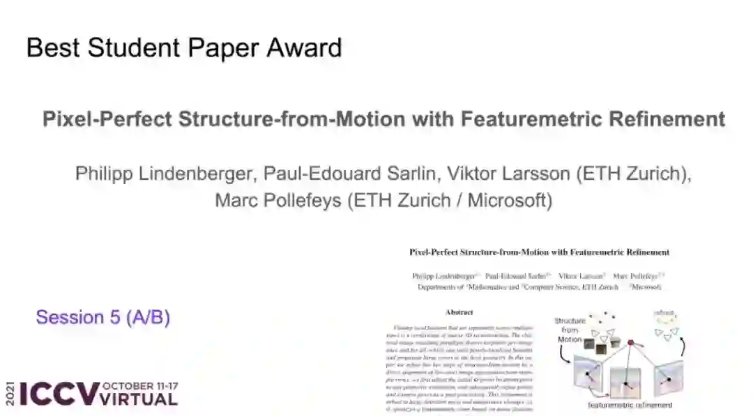 寻找在多个视图中可重复的局部特征是稀疏三维重建的基础。经典的图像匹配范式对每幅图像的关键点进行一次性检测,这可能会产生局部表现差的特征,并将巨大的误差传播到最终的几何形 (final geometry)。在本文中,我们通过直接调整来自多个视图的低级图像信息,完善了SFM(structure-from-motion)的两个关键步骤。