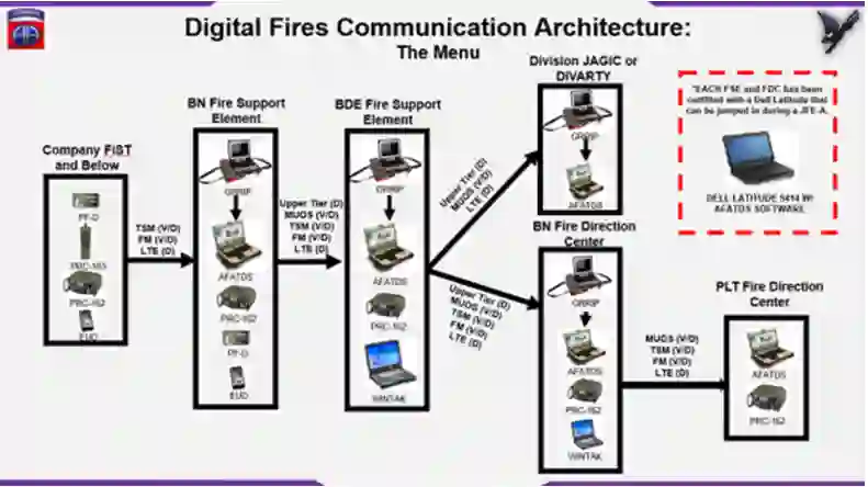 作为第82空降师第3旅的直接支援野战炮兵营,第319空降野战炮兵团第1营(1-319)通过分析新字段的火力装备如何融入旅级21能力集字段,启动了使用综合战术网络的进程。除上述装备外,前沿观察员现配备“精确火力-徒步型”(PF-D)——搭载于银河S-20终端用户设备的火力软件——及AN/PRC-163无线电设备,可通过单信道地面与机载无线电系统或战术可扩展移动自组网波形向营级火力支援单元发送数字火力任务、几何数据、视频、图片与信息。作为数字火力核心的营级火力支援单元,使用搭载先进野战炮兵战术数据系统软件的SRNC-4G笔记本电脑或戴尔纬度5414(本文后续将说明其作为先进野战炮兵战术数据系统的替代方案)连接AN/PRC-162无线电设备,以控制火力任务处理、分发产品和进行任务规划。AN/PRC-162无线电设备使部队能同时控制两个网络,具备超视距能力,且数据传输速度远快于单信道地面与机载无线电系统。凭借这些能力,第319空降野战炮兵团第1营开始设计新型杀伤链。