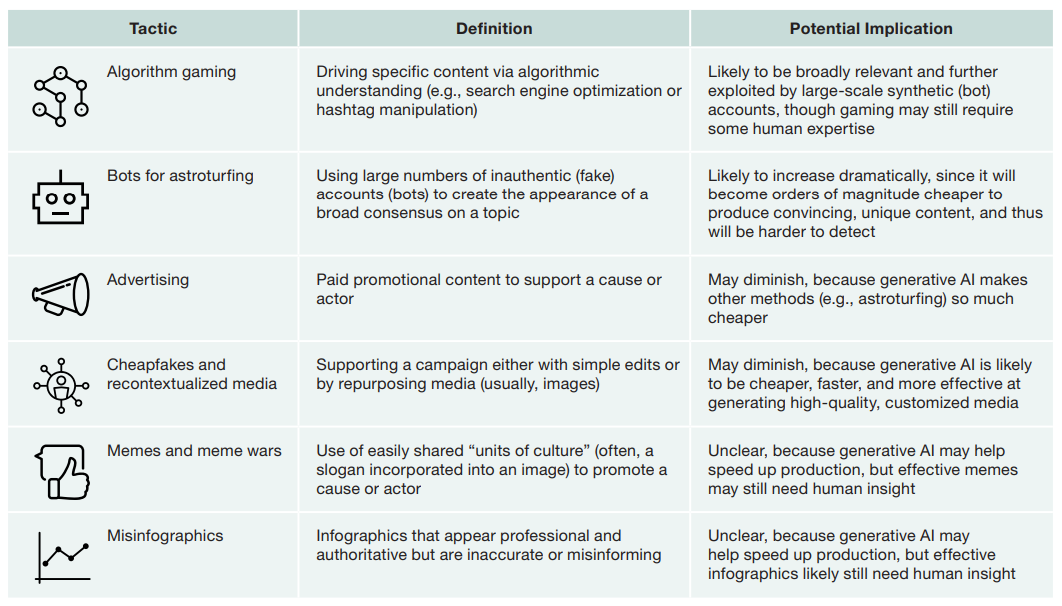 在世人的记忆中,2022 年可能是生成式人工智能(AI)之年:在这一年里,大型语言模型(LLM)(如 OpenAI 的 GPT-3)和文本到图像模型(如 Stable Diffusion)标志着社交媒体操纵潜力的巨大变化。针对对话进行了优化的 LLM(如 ChatGPT)可以大规模生成自然、人性化的文本内容,而开源的文本到图像模型可以生成任何(真实或想象的)逼真图像,并且可以大规模生成。利用现有技术,美国对手可以建立数字基础设施来制造逼真但不真实(虚假)的内容,从而为类似的逼真但不真实的在线人类角色推波助澜:Twitter、Reddit 或 Facebook 上的账户看似真实,实则是由人工智能生成的合成建构,并推进符合这些政府利益的叙事。