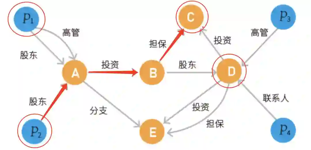 如图 4 所示,指定的个人节点** P1 **与企业节点 D 之间是否存在路径?需要找到源节点与目标节点之间的直接或间接路径,即任意两个节点之间的关联路径问题。