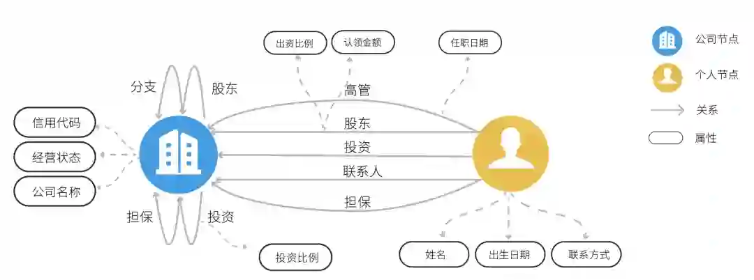 然后我们将这些整理好的数据,导入到已经构建好的业务本体模型当中。图 3 展示了知识图谱本体模式层的一部分,包含代表公司和个人的节点,代表企业之间的分支、股东、担保、投资等关系的边,代表个人与公司之间的高管、股东、投资、联系人、担保等关系的边,以及节点和边中包含的部分属性,其他大量属性如企业工商信息、个人信息等出于简洁的考虑,并未在图 3 中显示。