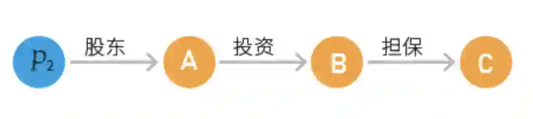 两个实体之间经过多个中间节点形成的关联路径,可以表示为它们之间的间接关联关系。对于实现业务目标来说:关联路径查询能够发现企业知识图谱中任意两个实体之间存在的路径,可以衡量企业之间联系的密切程度,发现可能存在的风险问题。以图 4 为例,查询 P2 和 C 之间的关联路径,其查询结果如图 5 所示,可以看出** P2** 和 **C **之间存在的联系。关联路径查询的算法如下所示。