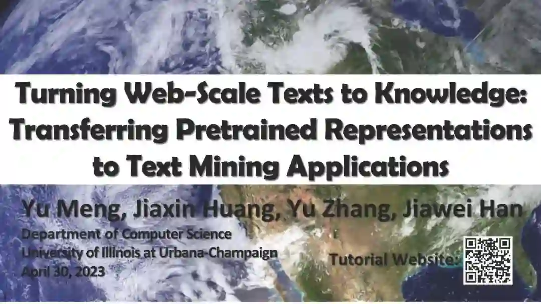 在本教程中,我们将介绍从网络规模的语料库中学习的预训练文本表示的最新进展,以及它们在广泛的文本挖掘任务中的应用。本文专注于不需要大量人工标注的弱监督方法,包括(1)作为下游任务基础的预训练语言模型,(2)用于从大规模文本语料库中发现主题的无监督和种子引导方法,以及(3)用于文本分类和高级文本挖掘任务的弱监督方法。