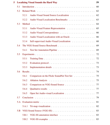 首先,我们自动管理一个大型音频数据集VGG-Sound,使用视觉引导收集了超过200k的视频,并在此基础上进行训练,生成最先进的音频识别模型。其次,我们提出了一种改进和扩展最近声源定位技术的方法,通过引入一种机制来挖掘硬样本并自动将其添加到对比学习公式中。最后,与在一个特定领域执行的现有视听同步任务不同,我们建议通过探索使用几种基于transformer的体系结构来解决开放世界设置中的同步问题。通过这些模型,我们在具有挑战性的语音数据集中获得了最先进的结果,并在一般声音数据集中显示了出色的泛化效果。