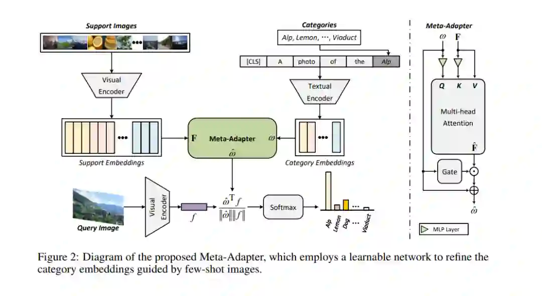 对比视觉-语言预训练,即CLIP,展现了在感知开放世界视觉概念方面的显著潜力,实现了有效的零样本图像识别。然而,基于CLIP的小样本学习方法通常需要在少量样本上进行离线微调参数,这导致了更长的推理时间和在某些领域过拟合的风险。为了应对这些挑战,我们提出了Meta-Adapter,一种轻量级的残差风格适配器,用以指导少样本在线细化CLIP特征。通过少量的训练样本,我们的方法可以实现有效的小样本学习能力,并且在没有额外微调的情况下泛化到未见过的数据或任务,达到了具有竞争力的性能和高效率。我们的方法不需要复杂的附加功能,就在八个图像分类数据集上平均超过了最新的在线小样本学习方法3.6%的性能,并且具有更高的推理速度。此外,我们的模型简单灵活,可作为直接适用于下游任务的即插即用模块。在无需进一步微调的情况下,Meta-Adapter在开放词汇的对象检测和分割任务中取得了显著的性能提升。