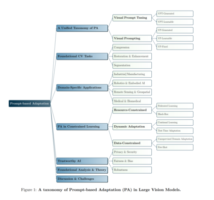 在计算机视觉领域,视觉提示(Visual Prompting, VP)与视觉提示微调(Visual Prompt Tuning, VPT)近年来作为轻量且高效的替代方案,逐渐成为在“预训练—微调(pretrain-then-finetune)”范式下适配大规模视觉模型的重要方法。然而,尽管该方向发展迅速,VP 与 VPT 的概念边界仍然模糊,两者在当前研究中常被交替使用,反映出学界尚缺乏对其方法特征及应用范围的系统区分。 在本综述中,我们从基本原理出发,重新审视 VP 与 VPT 的设计理念,并将其统一纳入一个称为提示式适配(Prompt-based Adaptation, PA)的框架中。我们提出了一套系统的分类方法,将现有研究划分为可学习提示(learnable prompts)、生成式提示(generative prompts)和不可学习提示(non-learnable prompts)三大类,并进一步依据注入粒度(injection granularity)区分为像素级(pixel-level)与标记级(token-level)两种方式。 除核心方法外,我们还系统回顾了 PA 在多个领域的融合与扩展,包括医学影像分析、三维点云处理、视觉-语言任务,以及其在测试时适配(test-time adaptation)与可信 AI(trustworthy AI)中的应用。同时,我们汇总了当前主要的评测基准,并探讨了该方向面临的关键挑战与未来研究趋势。据我们所知,这是首个专门聚焦于 PA 方法与应用的系统性综述,旨在为研究者与从业者提供一条清晰的路线图,以全面理解并探索提示式适配研究的最新进展与未来方向。 有关提示式适配方法的完整汇总,请参阅资源库: 👉 https://github.com/yunbeizhang/Awesome-Visual-Prompt-Tuning