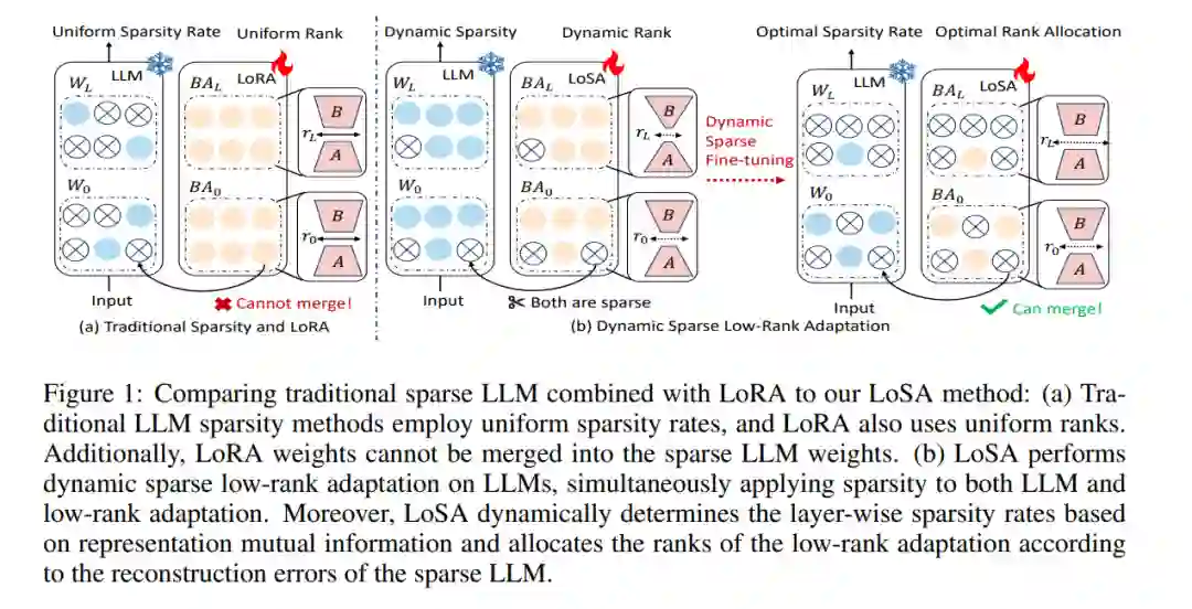 尽管网络稀疏性在缓解大型语言模型(LLM)部署压力方面具有一定效能,但仍存在显著的性能下降问题。将低秩适应(LoRA)应用于微调稀疏LLM提供了一种直观的方法来应对这一困境,但其存在以下不足:1)训练后无法将LoRA权重集成到稀疏LLM中,2)在高稀疏比率下性能恢复不足。本文介绍了动态低秩稀疏适应(LoSA),一种新颖的方法,在统一框架内将低秩适应无缝地集成到LLM稀疏性中,从而提升稀疏LLM的性能,同时不增加推理延迟。特别地,LoSA在微调过程中基于对应的稀疏权重动态稀疏化LoRA结果,从而确保LoRA模块能够在训练后集成到稀疏LLM中。此外,LoSA利用表示互信息(RMI)作为指标来确定各层的重要性,从而在微调过程中有效地确定各层的稀疏率。基于此,LoSA根据层级重构误差的变化调整LoRA模块的秩,为每一层分配合适的微调量,以减少稠密LLM和稀疏LLM之间的输出差异。大量实验表明,LoSA可以在几小时内有效提升稀疏LLM的效能,而不会引入任何额外的推理负担。例如,LoSA将稀疏LLaMA-2-7B的困惑度降低了68.73%,并将零-shot准确率提高了16.32%,在CPU上实现了2.60倍的加速,在GPU上实现了2.23倍的加速,仅需在单个NVIDIA A100 80GB GPU上进行45分钟的微调。代码可在https://github.com/wzhuang-xmu/LoSA获取。