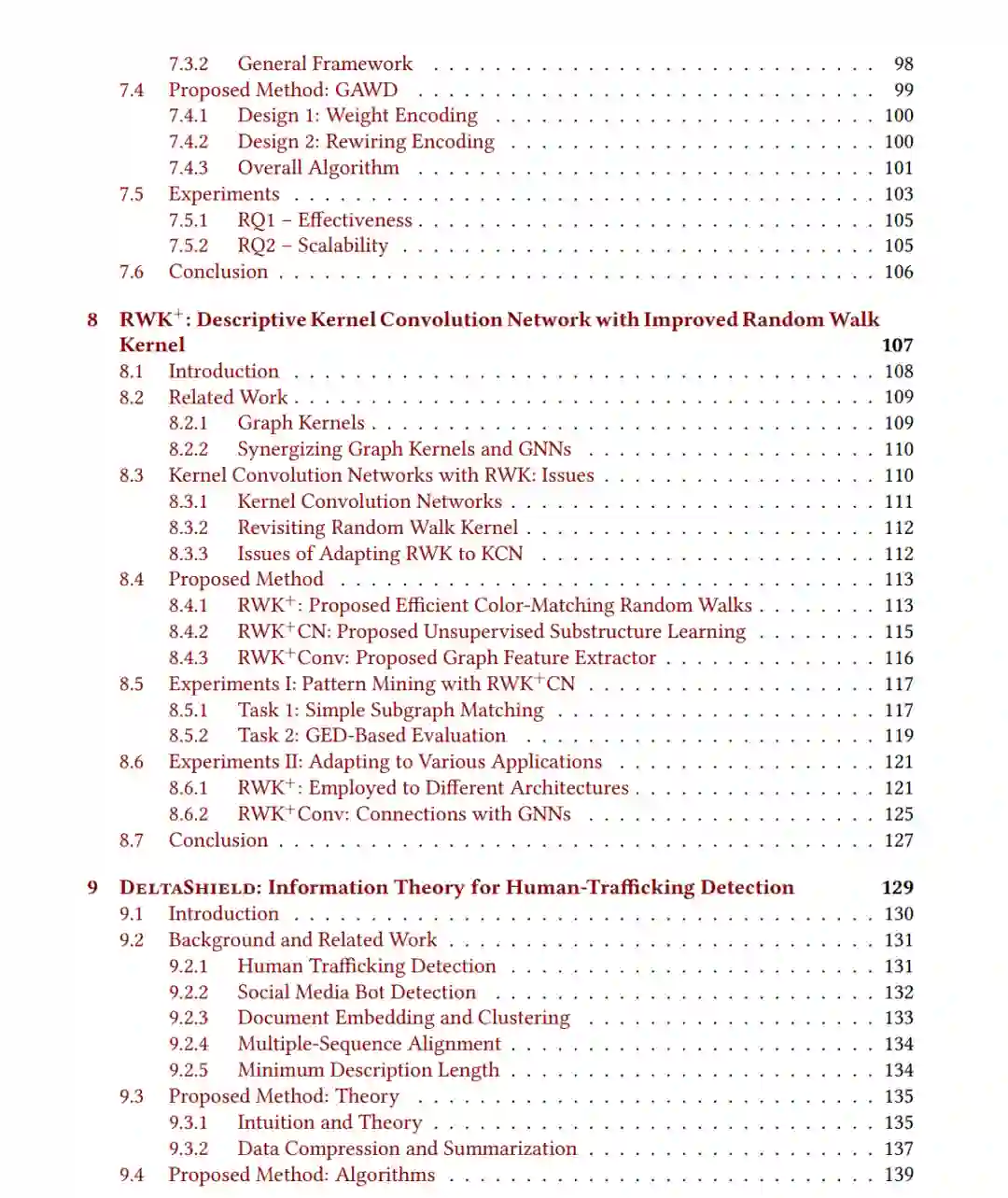第二部分聚焦于图级图挖掘。我们基于最小描述长度(MDL)原理和可学习图核方法,发现频繁子结构。在图异常检测任务中,我们基于 MDL 的方法比第二优基线快了 58 倍,同时平均精度提升了 1.3 倍。在图回归任务中,我们结合可学习图核的方法将平均绝对误差降低了 14.3%。在人口贩运检测的应用中,我们的方法以 84% 的精度检测出人口贩运广告,并在 8 小时内处理了 400 万份文档。