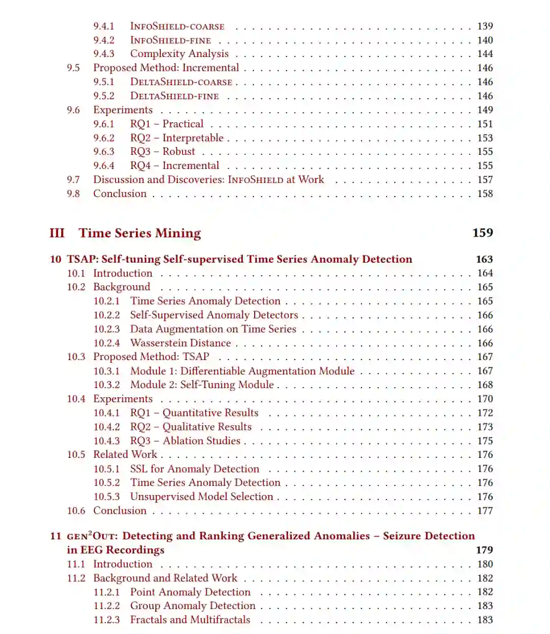 第三部分聚焦于时间序列挖掘,特别是时间序列的异常检测。我们提出的自监督方法能够有效识别时间序列数据中异常的真实超参数,在与基线方法的对比中获得了平均排序 2.2 的结果。在医疗 EEG 信号的应用中,与传统的点异常检测方法不同,我们关注的是在短时间内出现并呈现相似异常模式的群体异常。我们的方法具备高效性与可扩展性,能够在普通设备上用 2 分钟完成对 100 万个数据点的点异常和群体异常的发现与排序。