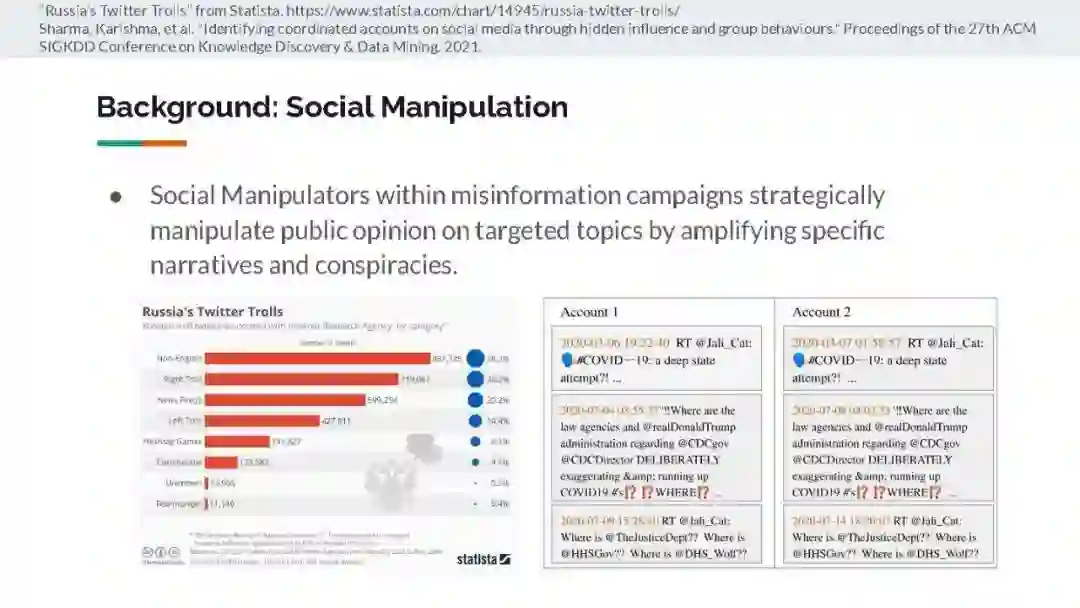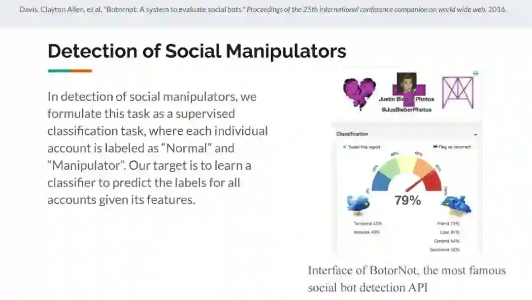 社交媒体上的操纵者检测:旨在通过识别活动模式和集体异常协同行为来检测社交媒体上的操纵者(如社交机器人和协调账户)。