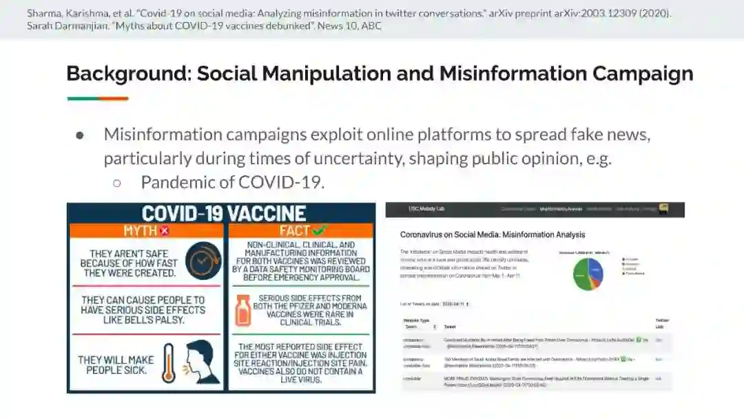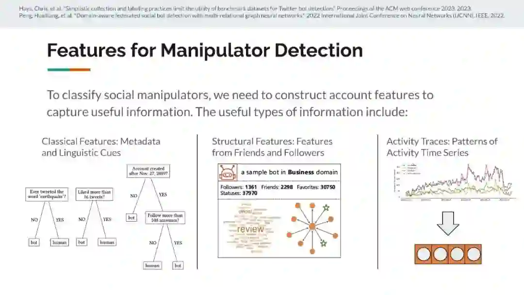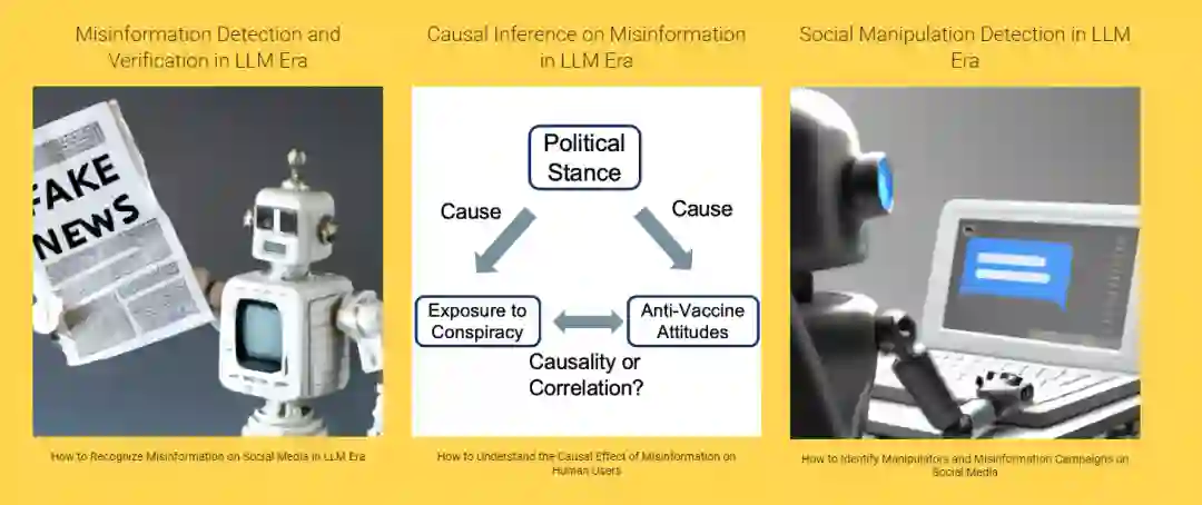 虚假信息在社交媒体上影响公众舆论的广泛滥用在各个领域变得越来越明显,涵盖了政治领域,如总统选举,以及医疗保健领域,尤其是在最近的 COVID-19 大流行期间。随着大规模语言模型(LLMs)的发展,操纵者能够更高效地生成高度令人信服的虚假内容,这一威胁变得更加严重。此外,最近整合了 LLMs 的聊天机器人(如 ChatGPT)的进步,使得创建类人交互的社交机器人成为可能,这对人类用户和社交媒体平台的社交机器人检测系统构成了重大挑战。这些挑战促使研究人员开发算法来缓解虚假信息和社交媒体操纵。本教程介绍了对实现这一目标有帮助的先进机器学习研究,包括(1)社交操纵者的检测,(2)虚假信息和社交操纵的因果模型学习,以及(3)大规模语言模型生成的虚假信息检测。此外,我们还提出了未来可能的研究方向。