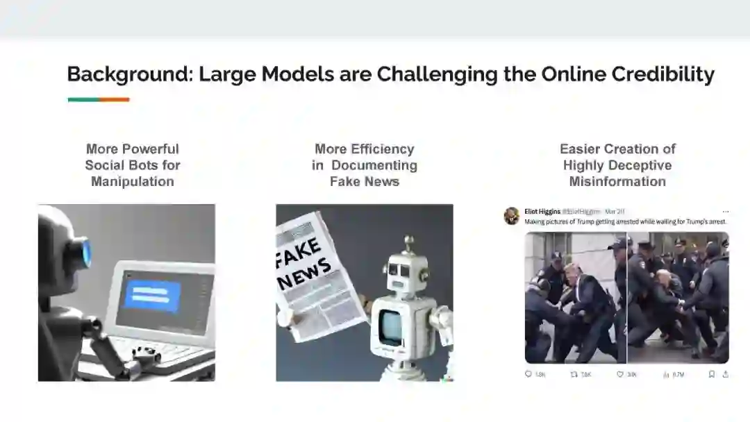 大模型时代的虚假信息检测。此方向聚焦于应用大模型检测虚假信息,包括传统的人为撰写的假新闻和由大规模语言模型生成的现代虚假信息,如操控文本和伪造或脱离语境的多模态媒体。