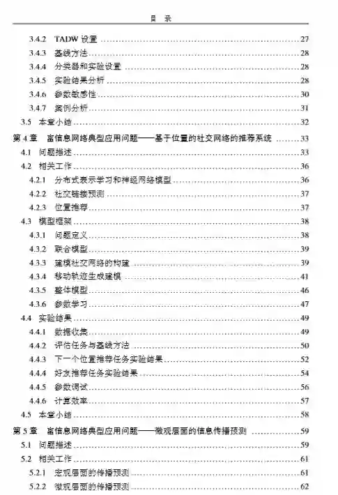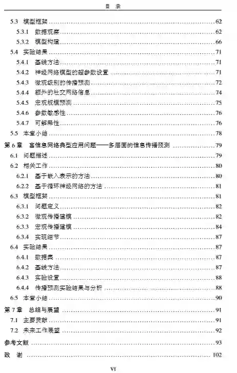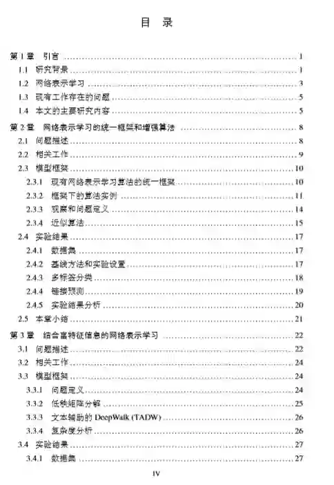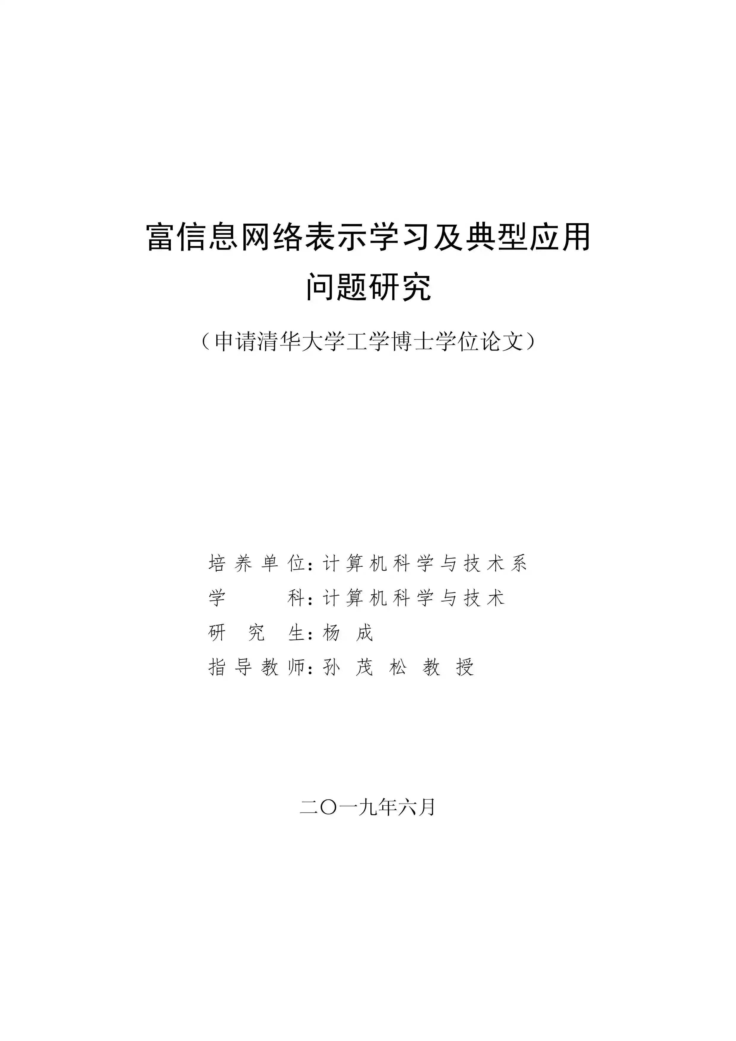 论文摘要:网络是表达对象与对象间关系的常用数据形式,在人们的日常生活与工作学 习中无处不在。除去网络的拓扑结构信息之外,真实的网络数据中一般还包含着 根据节点的属性、行为等产生的丰富信息,统称为富信息网络。随着互联网技术 和移动智能设备的发展,富信息网络的数据规模飞速增长,并带来了丰富的应用 任务和巨大的市场价值。在富信息网络数据的规模及其相关应用的研究需求日益 增长的同时,数据驱动的深度学习技术已经在计算机视觉、自然语言处理等多个 领域取得了巨大的成功。如何让已经在多个领域展示出其有效性的机器学习,特 别是深度学习技术,服务于富信息网络数据及其典型应用已经在近年来成为人工 智能领域的研究热点。 传统的邻接矩阵形式的网络表示具有维度过高和数据稀疏两大缺点,使得研 究者们无法在网络数据上应用机器学习和深度学习技术。因此,研究者们转而将 网络中的节点编码为低维稠密的向量表示,称为网络表示或者网络嵌入。为网络 中的节点学习其向量表示的任务称为网络表示学习。本文针对现有的网络表示学 习工作的缺点和不足,系统性地进行了以下五个工作: 针对缺乏对于已有网络表示学习算法的理论分析的问题,本文提出了网络表 示学习的统一框架和增强算法。本工作将大多数现有的只考虑拓扑结构信息的网 络表示学习方法总结为一个统一的两步框架:邻近度矩阵构造和降维,并进一步 提出了网络嵌入更新(NEU)算法,该算法从理论上隐含地近似了高阶邻近度,可 以应用于已有网络表示学习方法以提高它们的性能。 针对现有网络表示学习方法忽略了网络拓扑结构以外的丰富信息的问题,本 文提出了结合富特征信息的网络表示学习。受前一工作中得到的最先进的网络表 示学习算法实际上等同于一种特殊的矩阵分解的结论的启发,该工作以文本特征 为例,在矩阵分解的框架下将节点的特征信息结合到网络表示学习中。 针对现有网络表示学习方法难以应用于相对复杂的典型应用问题的缺点,本 文以网络表示学习技术作为模型底层,并根据特定的富信息网络场景利用包括循 环神经网络、卷积神经网络在内的深度学习模型进行建模,在推荐系统和传播预 测两个富信息网络典型应用问题中,创新性地提出了基于位置的社交网络的推荐 系统、微观层面的信息传播预测和多层面的信息传播预测的应用模型。