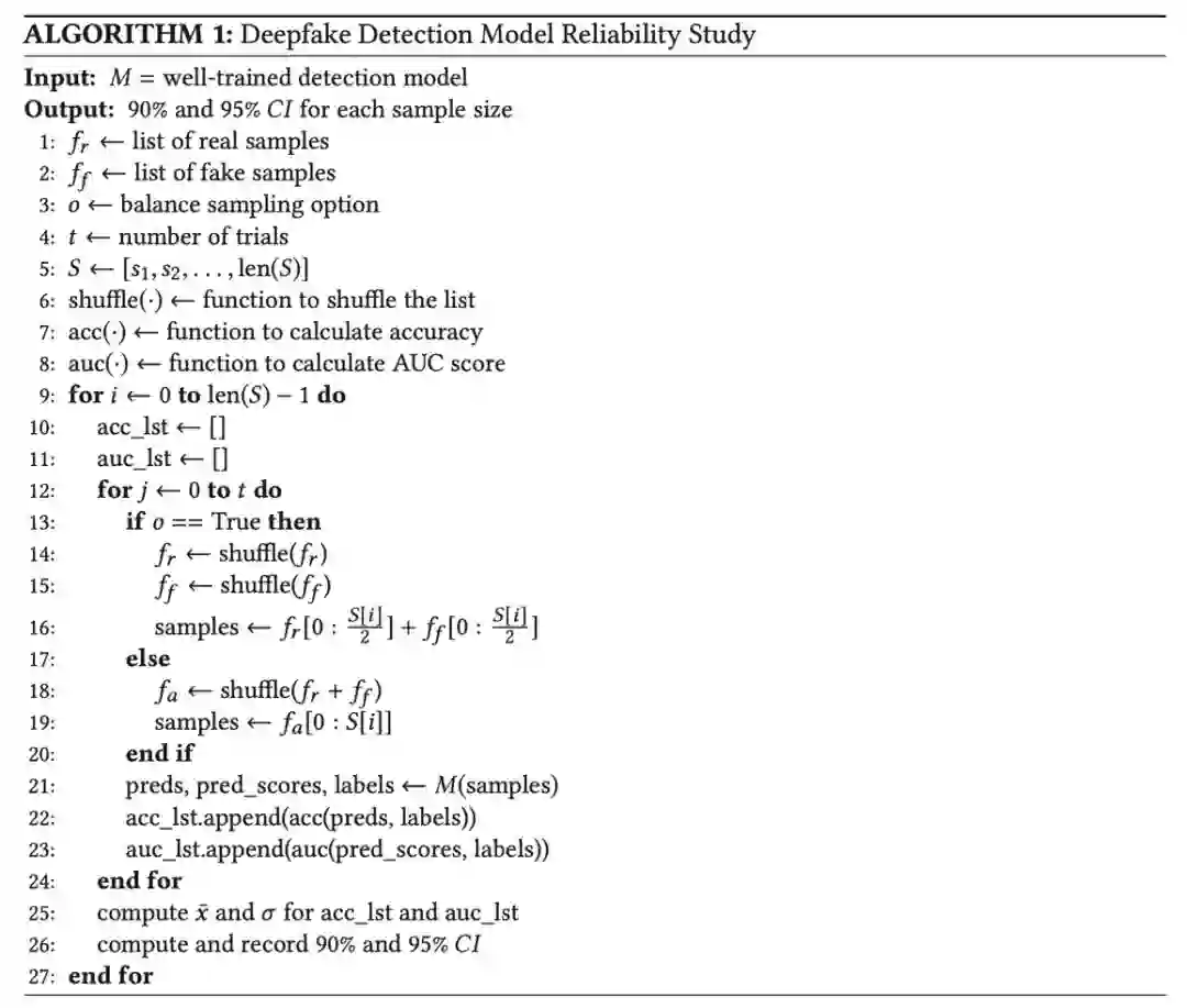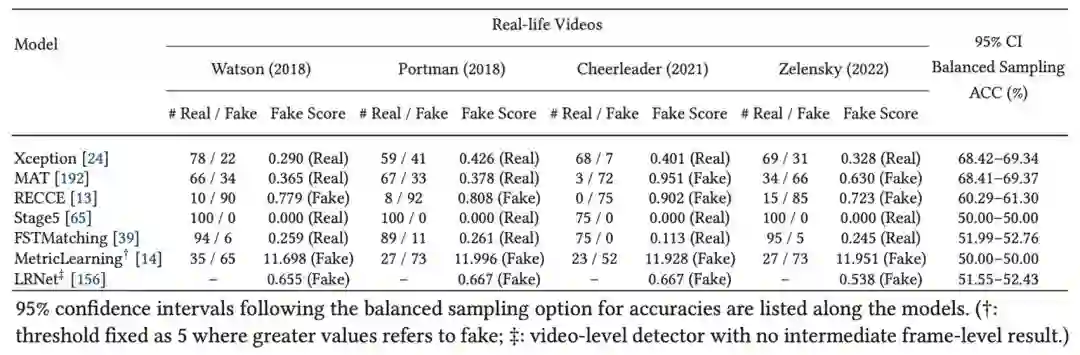 除了深入探讨三个话题和挑战的意义以及综述性地总结领域内的相关工作之外,本文还着重提出了一个**针对模型可靠性的评估方法 **(图 2)。 该方法受到司法鉴定中对 DNA 比对过程的启发,通过模拟和构建真实世界中的深度伪造数据的总 population,引入统计学中随机采样的方法,科学且严谨地评估深度伪造检测模型的可靠性,从而提供关于模型性能的统计学指标,以作为法庭审判的潜在证据和辅助证据。基于该指标,可得出在不同置信度条件下的模型检测准确率结论。该可靠性评估方法的初步探索,旨在提供一条路线可以使众多深度伪造检测模型能够在实际生活案例中真正发挥价值。 同时,该综述通过进行大量实验,在不同的样本集大小、置信度、采样次数等环境设定下,对为解决三种话题和挑战的七个深度伪造检测模型进行模型复现和可靠性分析。 图 2: 深度伪造检测模型可靠性分析算法。 此外,该综述将实验中的深度伪造检测模型应用在受害者分别为明星、政客、普通人的实际深度伪造案例中的假视频进行鉴伪和分析,并针对检测结果提供基于特定置信度条件下的模型检测准确率结论 (图 3)。 实验结果表明,当前领域内的现存深度伪造检测模型分别在迁移性、可解释性、鲁棒性话题方面各有建树,但当令其兼顾两个或三个话题和挑战时,在模型效果上则展现出了显著的权衡和取舍。 然而,通常来说,人们希望,一个可靠的深度伪造检测模型应同时具备良好的迁移性、通俗易懂的可解释性、稳定的鲁棒性,以便能够在实际生活中的深度伪造案例中保护和保障受害者的隐私安全。 因此,本综述论文所总结的理念、发现、结论也为深度伪造检测领域的研究者们提供了新的研究挑战与研究方向。
