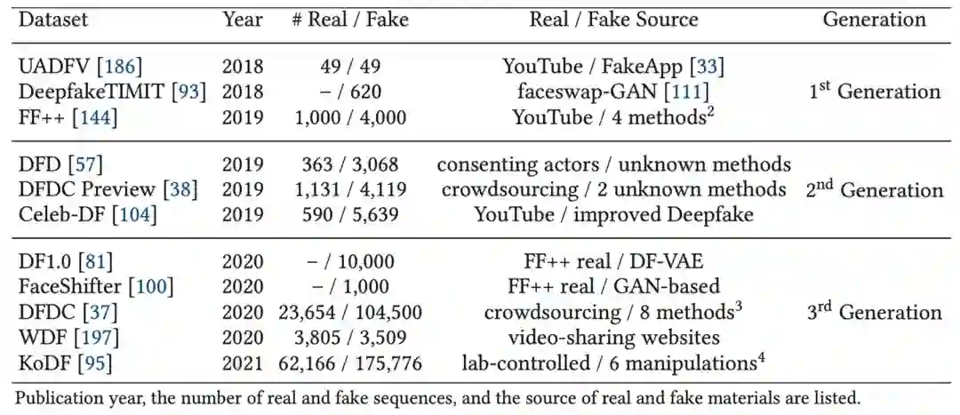 本综述由香港大学、齐鲁工业大学、湖南大学、圭尔夫大学联合发布,从可靠性的角度全面回顾了当前领域内的常用深度伪造基准数据库 (表 1) 和代表性检测模型,并基于现有检测模型的类型和优缺点,提出了三个值得领域内研究者们持续探索的话题和挑战 (图 1):迁移性、可解释性和鲁棒性。 表 1: 依据质量、多样性、难度等特点而划分的三代深度伪造基准数据库信息。 三大话题和挑战