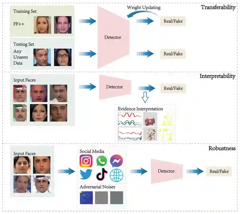 迁移性话题关注已完成训练的深度伪造检测模型是否能够在未曾见过的数据和篡改算法上依然维持令人满意的检测准确率。 详细来说,当一个深度伪造检测器在被广泛使用的 FaceForensics++ 数据集上完成训练后,除了在 FaceForensics++ 的测试集上展现出色的检测准确率,仍需要能够在 cross-dataset 和 cross-manipulation 设定下,维持较为稳定的效果。此目标旨在避免针对持续迭代出现的新的伪造数据和伪造算法时无休止地增加模型训练成本。 可解释性话题侧重于检测模型在判断真伪的同时能否额外提供令人信服的证据和通俗易懂的解释。 详细来说,当一个深度伪造检测器判断一张图片的真伪时,通常只能提供对其真或假的判断结论,以及在各个实验数据集上测试时的检测准确率。然而,对于需要依赖于检测模型来保护个人隐私信息的非专业人士,能够提供除准确率指标之外通俗易懂的额外证据 (例如,被标记的伪造区域定位或被可视化的伪造痕迹和噪声) 是极其重要的。 鲁棒性话题则基于已有的客观模型检测效果,着眼于实际生活场景,关注深度伪造素材在传播中遭受主观和客观画质损失后,是否依然可以被检测器正确判断。 详细来说,深度伪造素材的危害随着其在网络中的持续性传播而不断增加,而在上传、下载、转载等传播过程中,受不同平台对素材属性的限制和协议要求,该素材将不可避免地遭受质量上的折损和降低。另一方面,当攻击者 (即深度伪造素材的制造者) 已知领域内已有针对各类深度伪造算法的检测手段时,其会刻意向伪造的素材内有针对性地添加能够一定程度上扰乱深度伪造检测器的噪声。以上两类情况,都需要依赖于深度伪造检测模型的鲁棒性,从而可以持续地在实际生活案例中发挥作用。 图 1 : 关于三种话题和挑战的阐述 **评估与实验 **